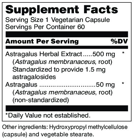 Astralagus Max-V, provided by Douglas Laboratories, supplies 500 mg of standardized astragalus in a vegetarian capsule.