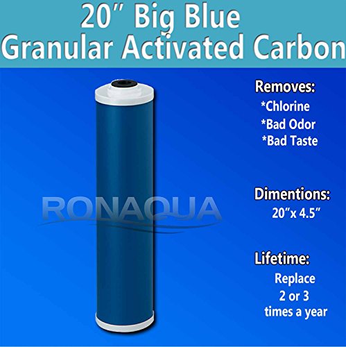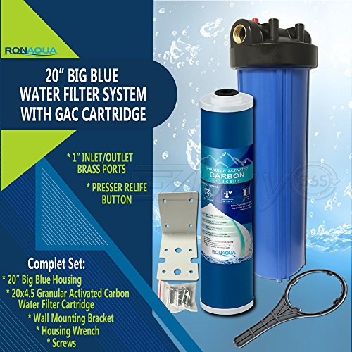 Whole House Water Filter Purifier System, Big Blue Housing with Presser Relief Button, 1” Inlet/Outlet Brass Port & (GAC) Granular Activated Carbon Filter Cartridge (20 Inches)