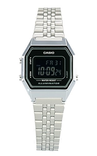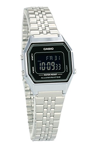 ladies watch, brand Casio model code la680wa-1bdf. 28mm case size, made of steel linked to a beautiful color steel strap silver. Quartz movement with sliding lacing.