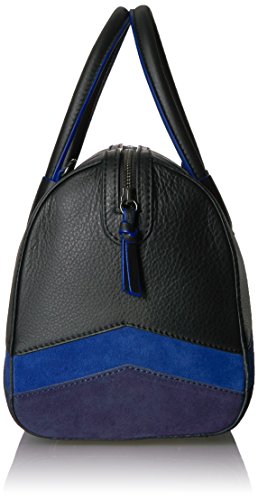 Leather satchel featuring rolled top handles and suede colorblock chevron design