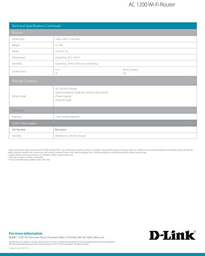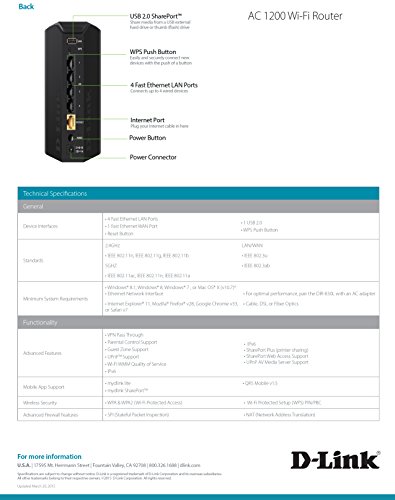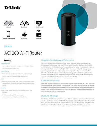 The D-Link Wireless AC1200 Dual Band Cloud Router (DIR-830L) delivers next-generation wireless speed and coverage to all your Wi-Fi devices. With wireless dual band speeds of 300 and 867Mbps, the DIR-830L avoids interference to deliver the fastest wireless speeds, improved coverage and reliable connections. The DIR-830L is ideal for streaming HD video, gaming, connecting multiple devices, and watching shows on your TV - all at the same time.Feature