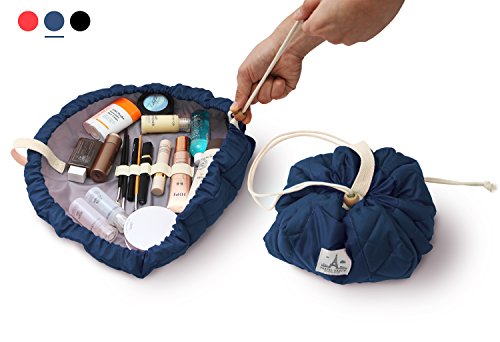 - STYLISH : This makeup drawstring bag, unlike the other similar lazy makeup bag for makeup out there, is beautifully quilted flat makeup bag for womens makeup with three stylish colors : red, black, navy