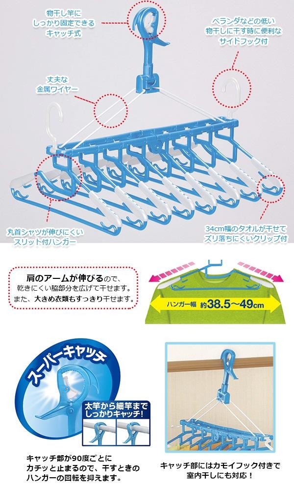 シャツやタオルをまとめてすっきり干せる、折りたたみ式の8連洗濯ハンガーです。急な降雨時など、洗濯物をサッと取り込みやすい下折れ式。 |