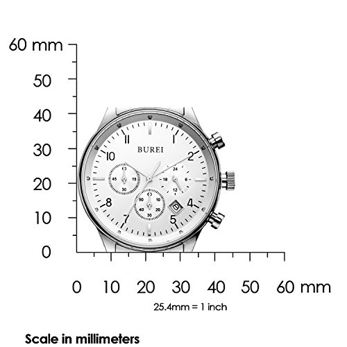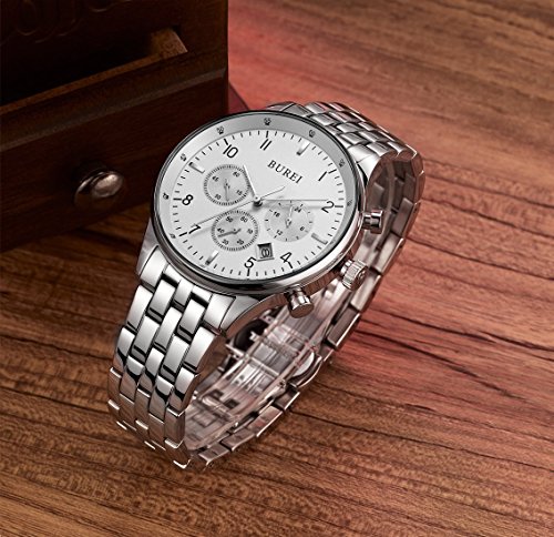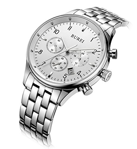 -. Title : (バオショ)BUREI メンズ 腕時計 ステンレス クロノグラフ 日付 クォーツ時計 銀色バンド ブラック文字盤 金色指針