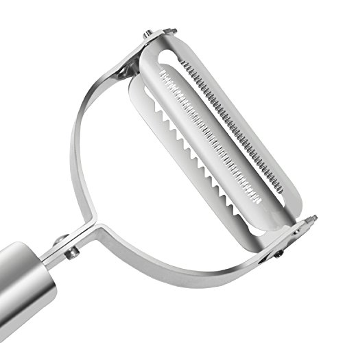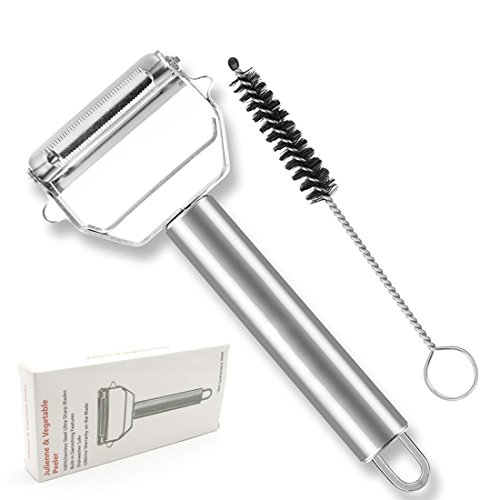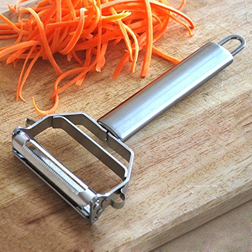 Ultra Sharp Swivel Vegetable & Julienne Blades ------ Designed with swivel razor-sharp blades, this peeler can quickly and easily peel, slice or julienne without any clogging. Works well on most fruits and vegetables such as apples, pears, potatoes, carrots, cucumbers, zucchinis, squashes. Can easily slice cheese for sandwiches or pasta and make veggies noodles with ease.