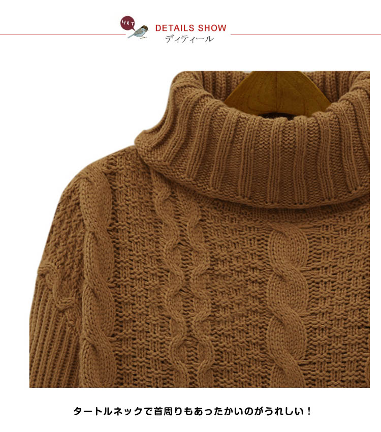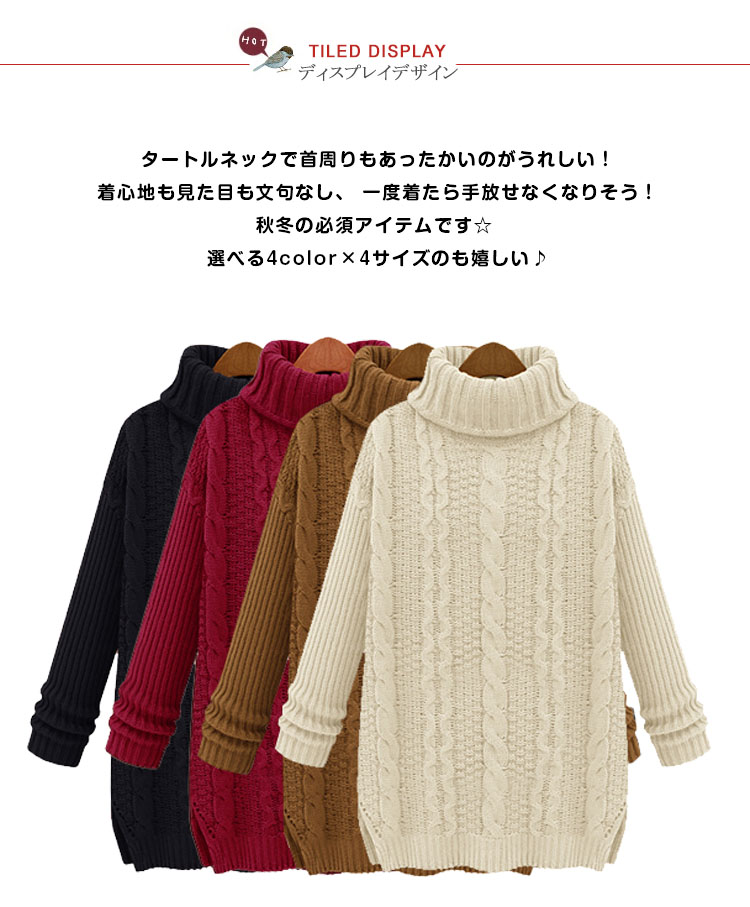 | ボリュームのあるタートルネックで暖かなニットトップスタートルネックで首周りもあったかいのがうれしい!着心地も見た目も文句なし、 一度着たら手放せなくなりそう!秋冬の必須アイテムです☆ 選べる4color×4サイズのも嬉しい♪デニムでカジュアルにしたり、チュールスカートで大人カワイイ雰囲気のスタイリングにするのもおすすめ。 | |