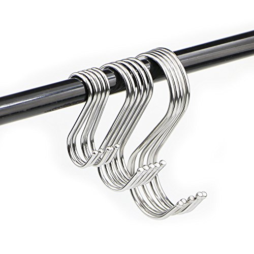 - USER FRIENDLY AND SAFE: There is no need to worry with tools or fret over putting holes in your beautiful walls. S hooks easily hang on existing objects (e.g., racks, bars, and shelves) without the need for nails, screws, or adhesives. Made from durable stainless steel, these hooks are strong and safe, so you can hang heavier items without fear of them falling or becoming damaged.