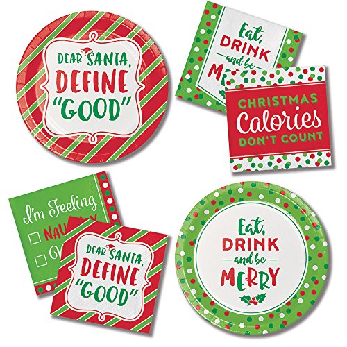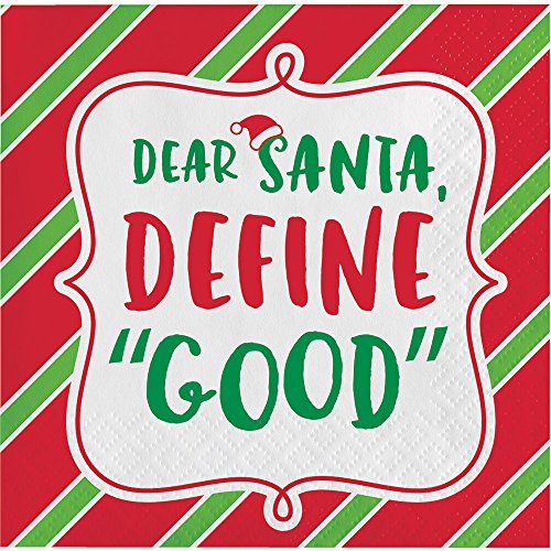 - Napkin in holiday green, red and white, reads: Dear Santa, Define "Good"