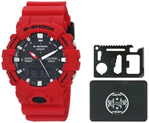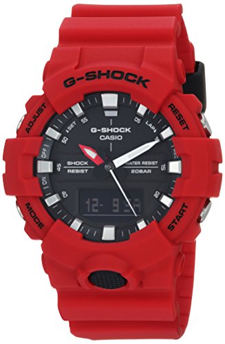 Brand, Seller, or Collection Name:Casio Part Number:GA-800-4ANNV Item Shape:Round Dial window material type:Mineral Display Type:Analog and digital Clasp:Buckle Case material:Resin Case diameter:40 millimeters Case Thickness:13.6 millimeters Band Material:Resin Band length:Men's Standard Band width:26 millimeters Band Color:Red Dial color:Black Bezel material:Resin Bezel function:Stationary Calendar:Day, date, and month Item weight:2.24 Ounces Movement:Quartz Water resistant depth:660 Feet