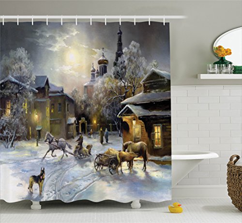 Country Decor Shower Curtain Set by Ambesonne, Winter Landscape of a Western Town at Night in New World Rurals in Retro Style Art Print Deco, Bathroom Accessories, 84 Inches Extralong, Multi