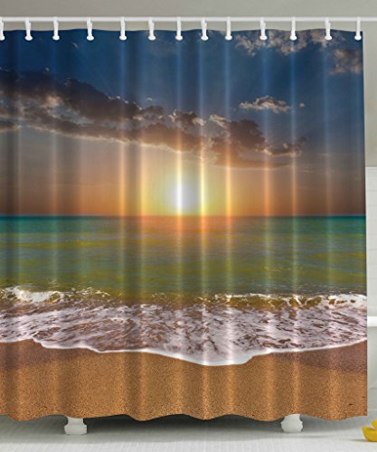 Beach Sunset Print Polyester Fabric Beach Lovely Bathroom Art Romantic Design Special Dreamy Creation Sweet Memory Decor Shower Curtain, Navy Gray Yellow Orange Turquoise Khaki White, Extra Long