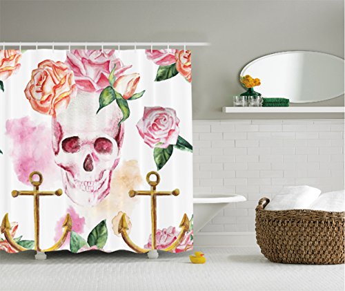 Skull Shower Curtain Decorations by Ambesonne, Nautical Anchor Flowers Roses and Peonies Vintage Art Decor Painting, Polyester Fabric Bathroom Shower Curtain Set with Hooks, Pink Orange