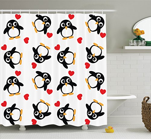 Sea Animals Decor Shower Curtain Set By Ambesonne, Penguins With Heart Shapes Lovely Sweet Romantic Valentines Day, Bathroom Accessories, 69W X 70L Inches