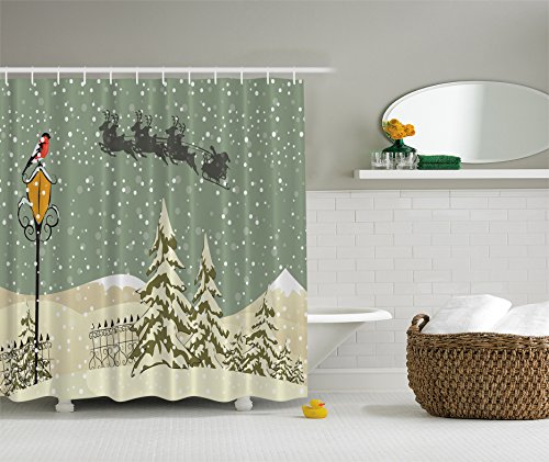 New Year Shower Curtain Santa Claus's Flying Reindeer Christmas Green Beige White