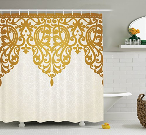 Antique Decor Shower Curtain Set by Ambesonne, Victorian Style Medieval Motifs with Classic Baroque Oriental Decorating Shapes Print, Bathroom Accessories, 75 Inches Long, Golden Cream