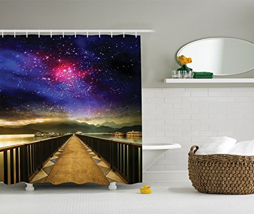 Galaxy Shower Curtain Universe Decor by Ambesonne, Galaxy Cosmos and Wooden Bridge Panoramic View Celestial Print, Polyester Fabric Bathroom Shower Curtain Set with Hooks, Blue Magenta Black