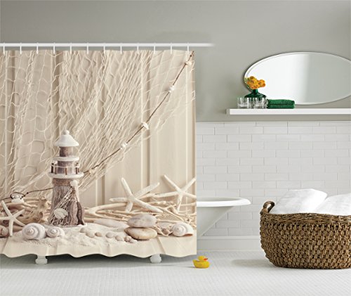 Beige Wooden Lighthouse Shower Curtain Nautical Decor by Ambesonne, Marine Fishing Net Sea Stars and Shells Picture, Polyester Fabric Bathroom Set with Hooks, 75 Inches Long, Ecru Ivory Beige