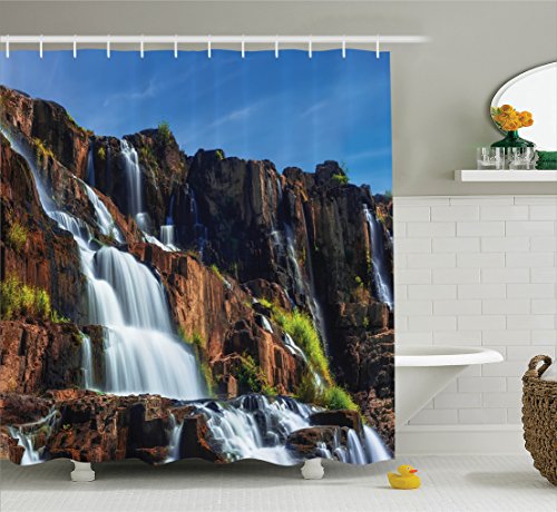 Rainforest Decorations Shower Curtain Set by Ambesonne, Pongour Waterfall Exotic Asian Natural Beauty Landscape Mountain Rocks Print, Bathroom Accessories, 84 Inches Extralong, White Blue