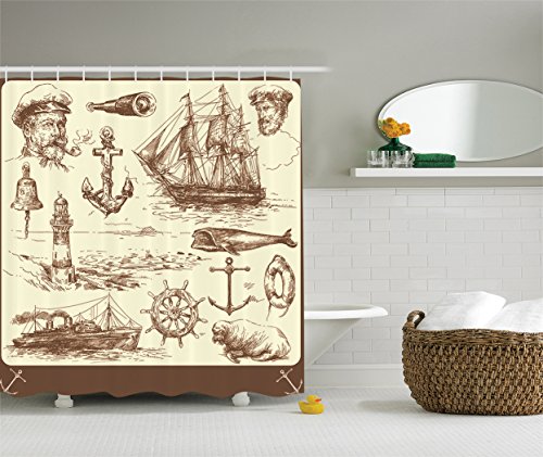 Nautical Shower Curtain Marine Navy Decor by Ambesonne, Ocean Retro Drawing Effect Captains Framed Design, Polyester Fabric Bathroom Shower Curtain Set with Hooks, Brown Cream