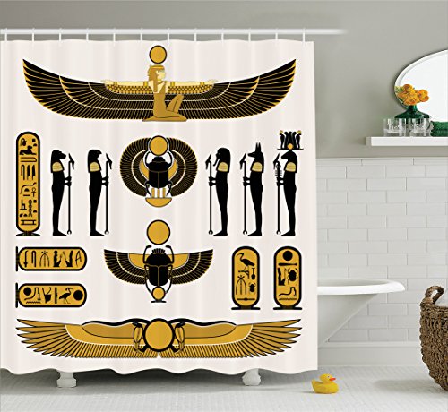 Egyptian Decor Shower Curtain Set by Ambesonne, Illustration of Old Historical Egyptian Spirit Symbol Myth Icons Mummy Ra Sun Art, Bathroom Accessories, 75 Inches Long, Yellow Black