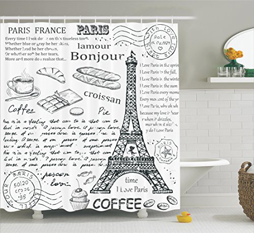 Paris Decor Shower Curtain Set By Ambesonne, Traditional Famous Parisian Elements Bonjour Croissan Coffee Eiffel Tower Illustration, Bathroom Accessories, 69W X 70L Inches, Black White