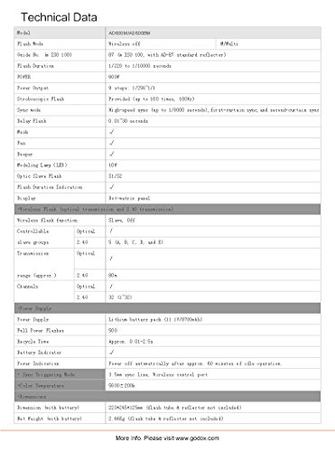 600Ws, GN87, 9 steps of power adjustment(1/1 to 1/256). Stable color temperature at 5600±200K over the entire power range.