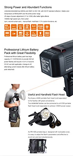 11.1V/8700mAh large capacity lithium battery pack to provide 500 full power flashes and recycle in 0.01-2.5 second. DC/AC are both applicable(Change to AC alternating current module after lithium battery pack detached).
