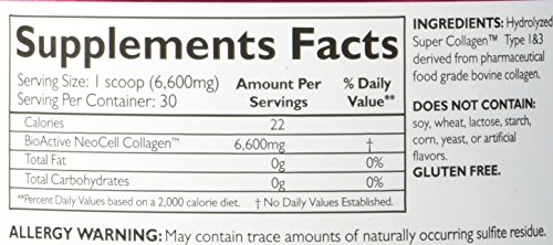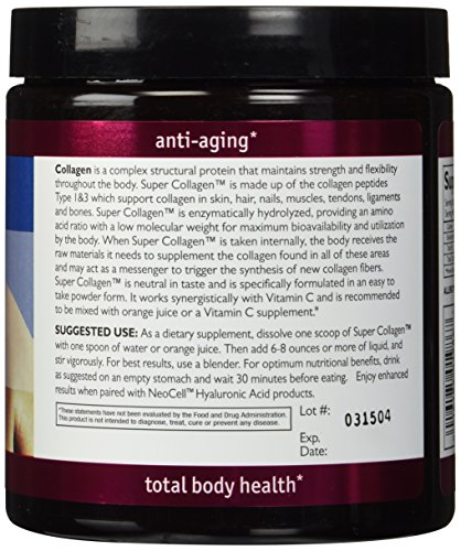 -. Binding : Health and Beauty -. Brand : Neocell -. EAN : 0750869861938 -. Label : Neocell -. Manufacturer : Neocell -. MPN : Neocell - Super Collagen 7oz (2 pack) -. PackageQuantity : 2 -. PartNumber : Neocell - Super Collagen 7oz (2 pack) -. ProductGroup : Health and Beauty -. ProductTypeName : HEALTH_PERSONAL_CARE -. Publisher : Neocell -. Studio : Neocell -. Title : Neocell Super Powder Collagen, Type 1 and 3, 7 Ounce (2 Pack) -. UPC : 750869861938 Super collagen powder type iandIIi : the collagen peptides type 1 and 3 in super collagen support collagen in tendons, ligaments, hair, skin, nails, and lean muscle. These two types of collagen are the main types found in connective tissue making up 90% of the body's total collagen content. Super collagen is rich in hydroxyproline and hydroxylysine, which are two key amino acids specific only to collagen and especially important to collagen production. The benefits of supplementing with super collagen are twofold: the body is nourished with collagen 1 and 3 where it is deficient and then super collagen acts as a messenger to trigger the synthesis of new collagen fibers. Super collagen is derived from pharmaceutical food grade bovine collagen that is extracted from the dermal layer. Super collagen is then enzymatically hydrolyzed, providing a collagen amino acid ration with a low molecular weight for maximum bioavailability. Because super collagen genetically parallels the amino acid structure of our own body's collagen, persons taking super collagen will experience a 90% absorption rate into the blood stream where cellular changes occur.