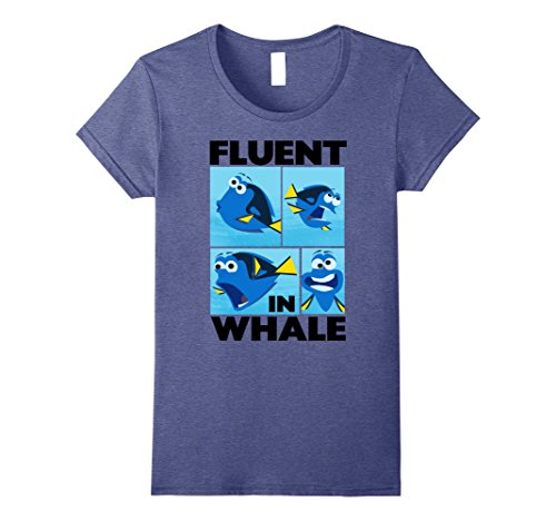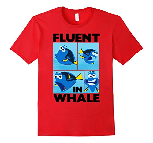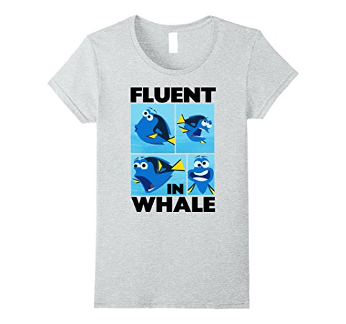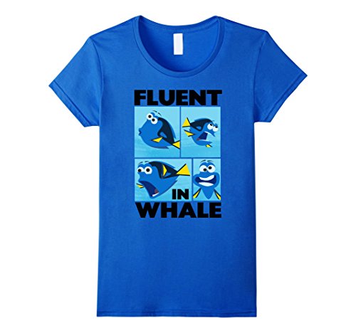 Show off your knowledge of other languages with the Finding Dory Fluent in Whale Graphic T-Shirt! Big black letters spell out "Fluent in Whale" next to four images of Dory speaking whale printed on the front of this funny Finding Dory shirt.Feature