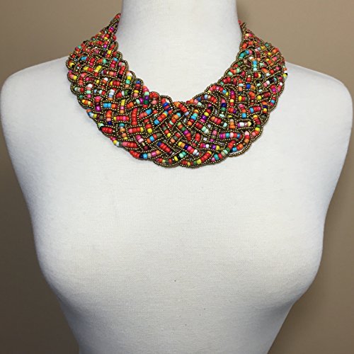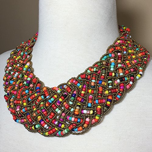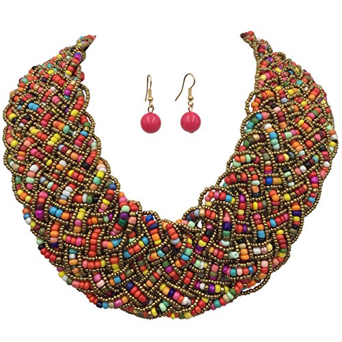 Wide Braided Seed Bead Multi Strand Statement Necklace & Earrings Set (Multi Color)