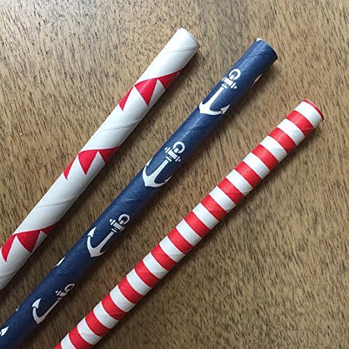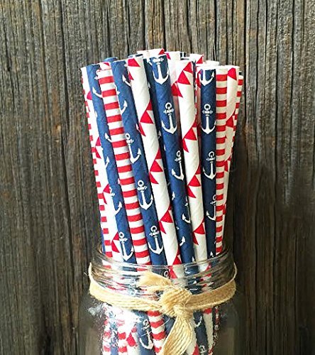 Anchor, Sailor Themed Party Paper Straws 7.75 Inches 75 Pack Red, White, Blue