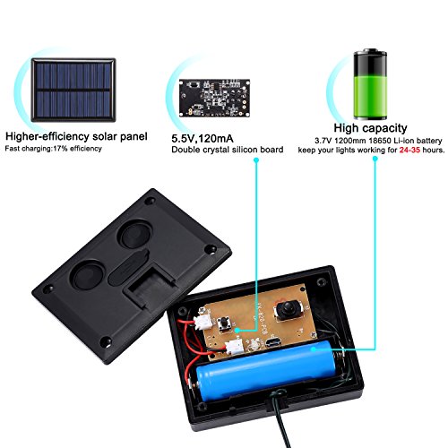 - Double charging mode: Do not worry about cloudy or no electricity, Built-in 5.5V 120mA Double crystal silicon board is powered by solar panel under sunlight or rechargeable 3.7V 1200mAh lithium battery is powered by USB, charged during the day by choosing one way and light up at night without any external power source, Safe, no hidden danger. and the solar panels can be rotated 180 degrees, easy to charge in different sun exposure environment
