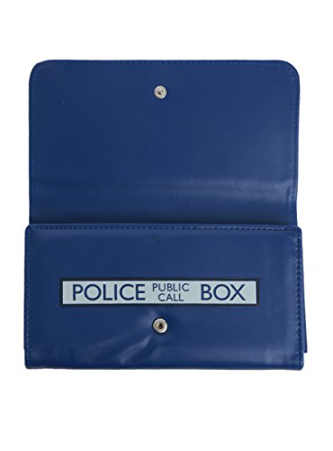 -. Feature : On the outside, this TARDIS-blue Doctor Who TARDIS Ladies Wallet looks like the Doctor's time machine. / On the inside of the bi-fold wallet, you'll find plenty of room and slots for your ID, credit cards, and other important stuff. / If the Doctor was a lady, she'd buy one of these! / Made of Pleather and measures about 8-inches long x 4-inches wide. / Item is experiencing manufacturer delays