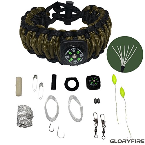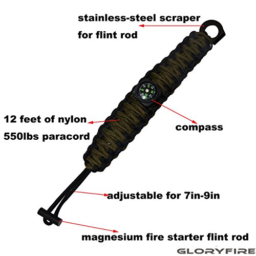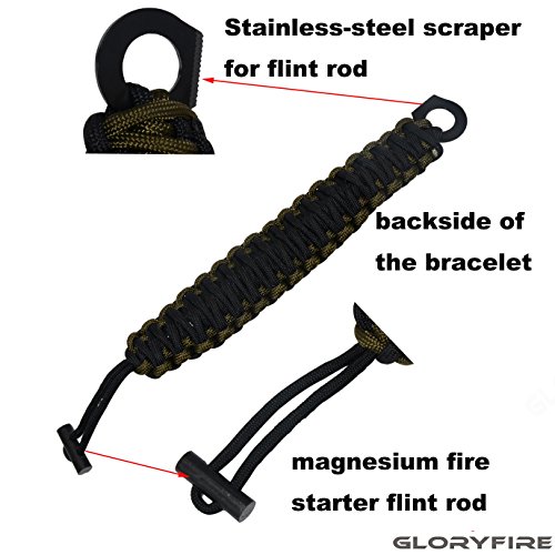 - 2. Fashionable and Functional: GLORYFIRE Paracord Bracelet is made of ultra-strong, military-grade 550lbs Paracord with high quality compass, fire-starter and emergency knife. Magnesia Rod (Flint Fire Starter) gives you an easy solution when lighting a fire is a matter of an emergency. Rub the rod to the scraper then you get spark and fire immediately. Emergency gear necessary for everyone.