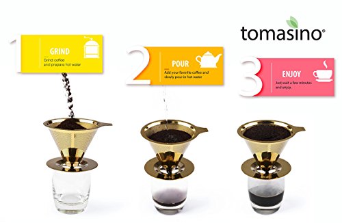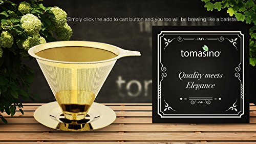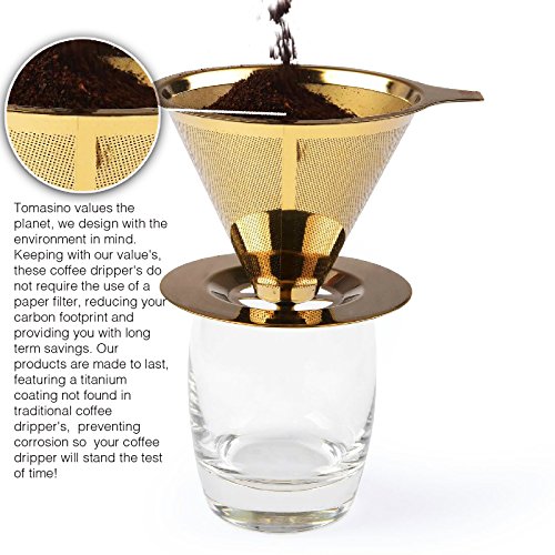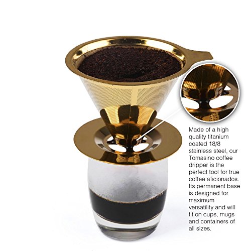 -. Brand : Tomasino Coffee -. Color : golden -. EAN : 0786830364559 -. Feature : EXCELLENT DESIGN - Our stainless steel pour over coffee drippers feature precision cut micro holes in a double mesh that keeps coffee grounds isolated from the bottom. The fine mesh design of our coffee drippers prevents even the smallest coffee grounds from ending up at the bottom of your cup. The result? Only the cleanest, freshest taste possible / EXTRACTION - Allows more essential oils and aromatics to escape from the coffee for a tastier brew. / HIGHLY DURABLE - Featuring a titanium coating not found in traditional coffee drippers, preventing corrosion so your coffee dripper will stand the test of time! / ECO FRIENDLY - Does not require the use of a paper filter, reducing your carbon footP.R.Int and providing you with long term savings / UNIVERSAL FIT - Its permanent base is designed for maximum versatility and will fit on cups, mugs and containers of all sizes -. Label : Tomasino -. Manufacturer : Tomasino -. PackageQuantity : 1 -. ProductGroup : Kitchen -. ProductTypeName : KITCHEN -. Publisher : Tomasino -. Studio : Tomasino -. Title : Tomasino Premium Collection - Titanium coated Stainless Steel Pour Over Coffee Filter Gold Edition Brewer Drip Reusable Paperless Eco Friendly Ultra-fine Mesh Highly durable -. UPC : 786830364559