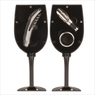 - Feature : Wine glass shaped tool kit / 3-piece accessory / Chromed metal tools / Includes combo corkscrew/bottle opener, drip stop ring and combo pourer/stopper / Rubberized plastic case measures 4 x 9 x 4-inches