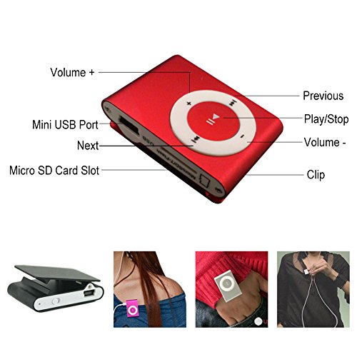 - Feature : Material: Metal. / Headphone Jack: 3.5mm stereo Jack / Package included: 1 x Clip MP3 Player; 1 x Mini USB 2.0 5PIN; 1 x Earphone(in-ear headhone); 1 x SD card reader(random color) / Size: 4.2cm x 2.8cm x 1.2cm - 1.65inch x 1.10inch x 0.47inch. / Color: Red