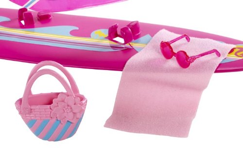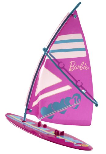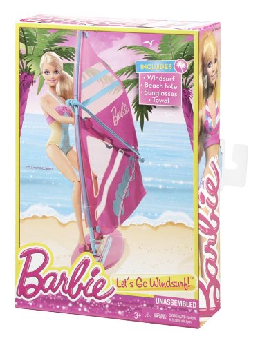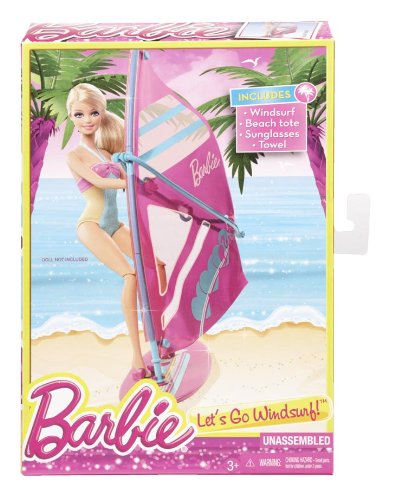 Barbie Let's Go Windsurf! Accessory Pack: With the Let’s Go Windsurf! set, Barbie doll is all set to catch a wave and some wind! Designed in signature Barbie doll pink and splashed with white and blue designs, this accessory pack is crafted with exquisite detail. From the deck to the sail, from the foot straps to the boom - this windsurfing board is for the real ocean athlete! The board and sail are decorated with hearts, swirling designs and silhouettes of Barbie herself. A towel, beach bag and sunglasses make the perfect accessories for fun on the waves, on the sand or “on the go”! Doll not included.Feature