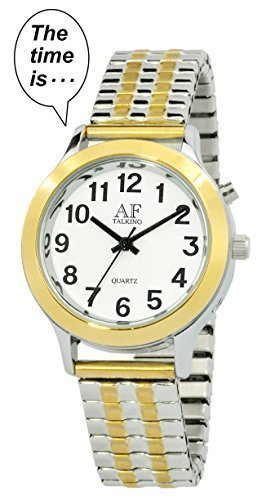 This AF Women's 2-tone Low Vision VHAS Analog Talking Watch talks the the time, day, date, month and year in a pleasant clear male voice at the touch of a button. With SENSES's latest VHAS (Voice and Hands Always Synchronizes) talking watch technology, the analog time and digital voice are always synchronized. Dislike old fashioned talking watch that confuses you like this - the analog hands shows time at 1:45 pm while the digital voice tells you 1:52 pm. Which one is correct?! This never happens in the SESNES VHAS talking watch. You read and hear the same time always! This casual-designed analog talking watch is ideal for those with Low Vision or Blindness. The easy-to-read bold black Arabic number big Hour Minute and Second hands on a white dial framed with a stylish round silver-tone metal case. Scratch resistant anti-reflective mineral crystal plus a comfortable leather band . The SENSES VHAS talking watch only uses 1 battery (included) for the movement of analog hands and digital voice. We provide battery replacement service to ease your work! Of course, you can buy battery on the TimeChant.hostedbywebstore.com for easy battery replacement at home.Feature