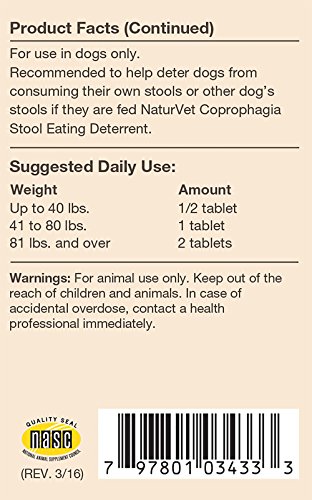 -. Binding : Misc. -. Brand : NaturVet -. Feature : Deters Stool Eating / Available in Time Release tablets or treat chews / NaturVet Supplements have a foam seal that comes off inside the lid the first time the bottle is opened. This is the manufacturer's seal, they do not have a secondary plastic safety seal on the outside. -. Label : NaturVet -. Manufacturer : NaturVet -. MPN : NV-COPRO -. PackageQuantity : 1 -. PartNumber : NV-COPRO -. ProductGroup : Pet Products -. ProductTypeName : PET_SUPPLIES -. Publisher : NaturVet -. Studio : NaturVet -. Title : NaturVet COPROPHAGIA DETERRENT - Stops Dogs from Eating Poop CHOOSE SIZE
