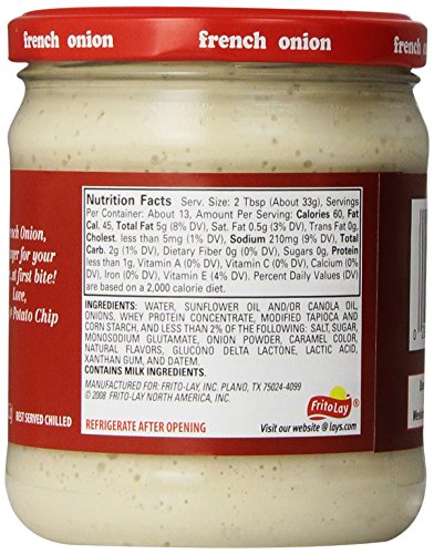 -. Binding : Grocery -. Brand : Lay's -. EAN : 0028400070942 -. Feature : Pack of Four 15.0 oz. jar of LAY'S French Onion dip / Grab a bag of LAY'S potato chips to enjoy this dip with friends / Great size jar for placing out at your family get-together / Pair with any LAY'S potato chips for snacking deliciousness -. Label : Frito Lay -. Manufacturer : Frito Lay -. Model : cfuda -. NumberOfItems : 4 -. PackageQuantity : 1 -. ProductGroup : Grocery -. ProductTypeName : GROCERY -. PublicationDate : 2016-04-07 -. Publisher : Frito Lay -. ReleaseDate : 2016-04-07 -. Size : 60 Ounce -. Studio : Frito Lay -. Title : Lay's Dips, French Onion Dairy, 15 oz -. UPC : 028400070942