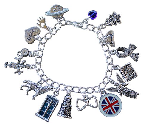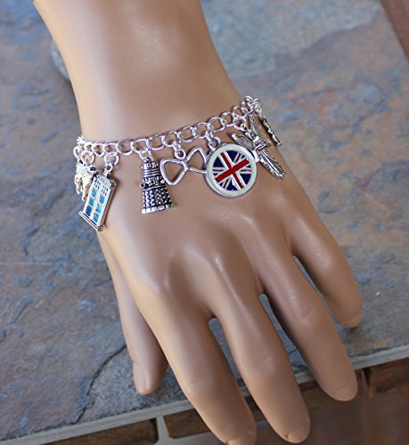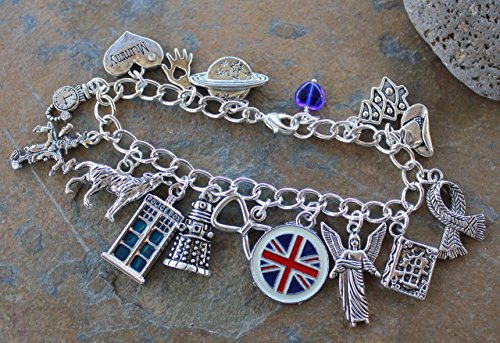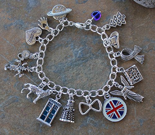 -. Feature : 16 pewter, zinc alloy and glass charms. Charms range from 1/2" to 1" tall. Tardis and UK flag charms are enameled. / Chunky silver plated steel bracelet chain with silver plated brass lobster clasp. / Available in size XS (6.5 inches), S (7 inches), M (7.5 inches), L (8 inches), and XL (8.5 inches). Please pick size from size choice boxes under item title. / Handmade in the USA by Night Owl Jewelry / Charms include planet, hand, Mummy heart, pocket watch, scarecrow, bad wolf, police box, killer robot, bow tie, Union Jack, angel, diary, scarf, cowboy hat, Christmas tree, and a cobalt blue glass heart.