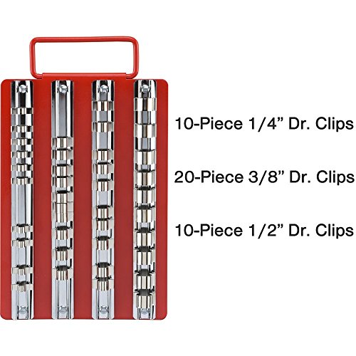 SET INCLUDES: 40 pieces multi-drive clips in 4 rails: 10 clips for 1/4” drive sockets, 20 clips for 3/8” drive sockets and 10 clips for 1/2” drive sockets