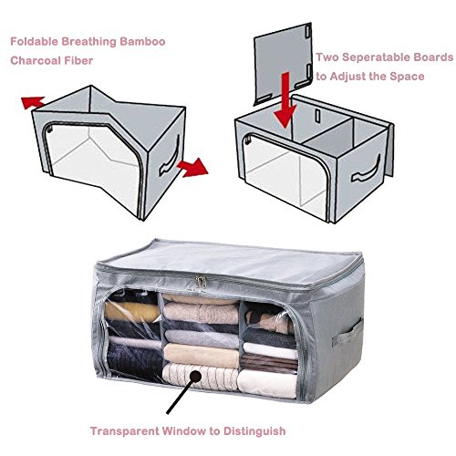 VOIMAKAS Bamboo Charcoal Storage Box, Folding Breathable Two Doors Clothing Quilt T-shirt Organizer Container Blanket Zipper Underbed Storage Bag - Grey
