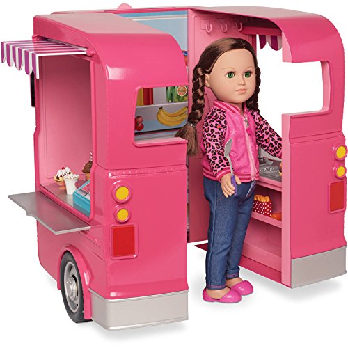 The My Life As Food Truck includes over 40 accessories, everything your 18-inch doll (sold separately) would need to start her own mobile business. Roll on down to the local park and sell your food with the flip-up chalkboard and food menus. Your doll can fit comfortably in the driver's seat and this truck has wheels that roll. The kitchen area expands for even more added play including a pretend griddle and sin