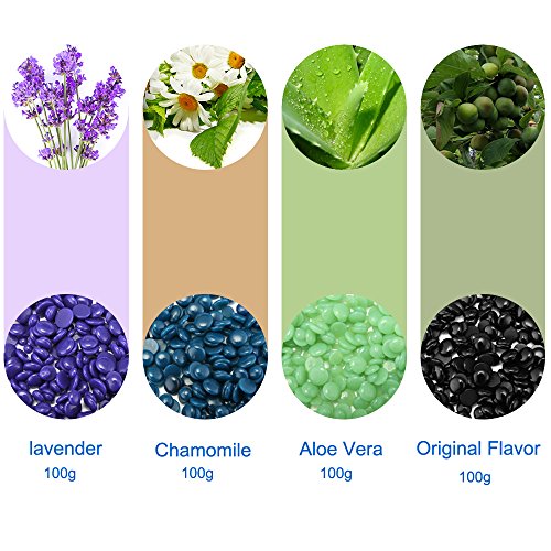 Package Include: 1 * Wax Heater 4 * 100g wax beans(lavender,Chamomile,Aloe vera,original flavor) 20 * Sticks 1 * Owner's manual the package for beans is creating, you may recieved the one diffirent from picture,but the beans is same.Thank you in advance! 0