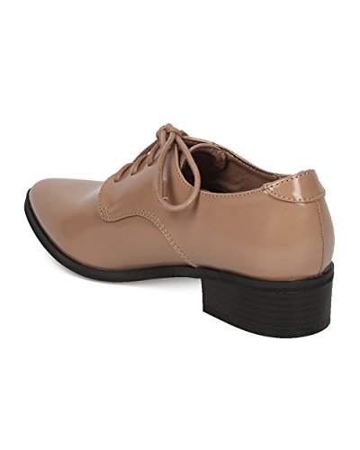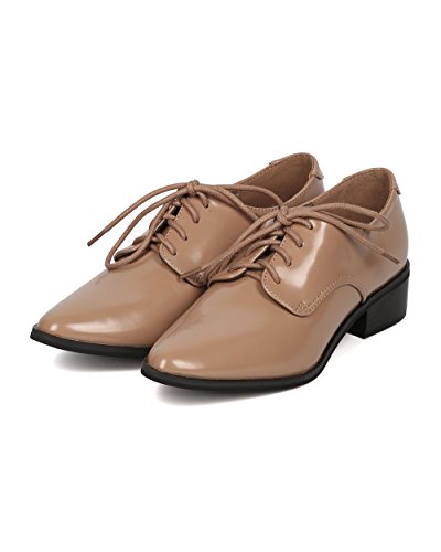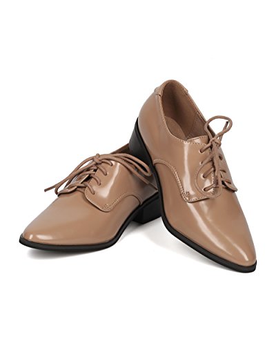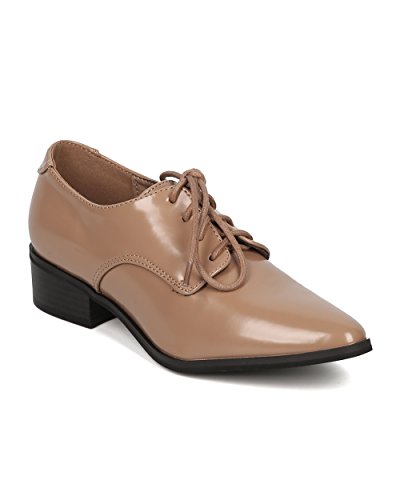 Product Description These pointy loafers are made with a polished leatherette finish, pointy toe and lace up front. Also made with a low stacked heel and self tie closure. 0