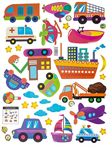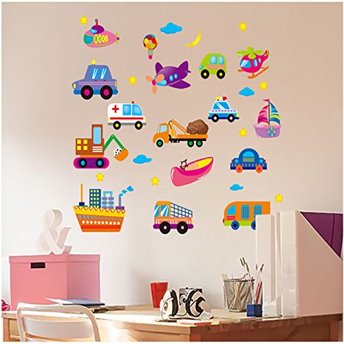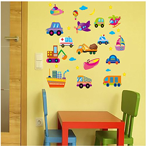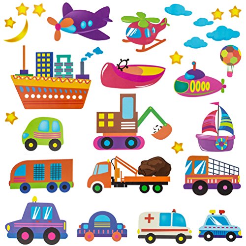 Transportation Theme Peel & Stick Kids Wall Decal - Colorful Nursery Decor Stickers of Cars Plane Boat and Construction Vehicles