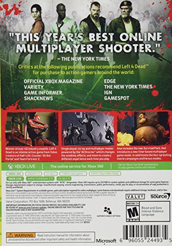 -. Author : Varios -. Binding : Video Game -. EAN : 0696055244829 -. Edition : Standard -. ESRBAgeRating : Mature -. Feature : Officially Licensed Product -. Genre : Shooter Action Games -. HardwarePlatform : Xbox 360 -. IsEligibleForTradeIn : 1 -. Label : Game World -. Manufacturer : Game World -. Model : 696055244829 -. MPN : 696055244829 -. NumberOfItems : 1 -. OperatingSystem : Xbox 360 -. PackageQuantity : 1 -. PartNumber : 696055244829 -. Platform : Xbox 360 -. ProductGroup : Video Games -. ProductTypeName : ABIS_VIDEO_GAMES -. PublicationDate : 2012 -. Publisher : Game World -. Studio : Game World -. Title : Platinum Hits Left 4 Dead 2 Xbox 360 -. UPC : 696055244829