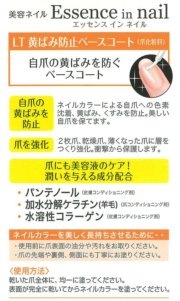 | ネイルカラーによる自爪への色素沈着、黄ばみ、くすみを防ぐベースコートです。また、2枚爪や乾燥爪、薄くなった爪を強化し、衝撃から保護します。 |
